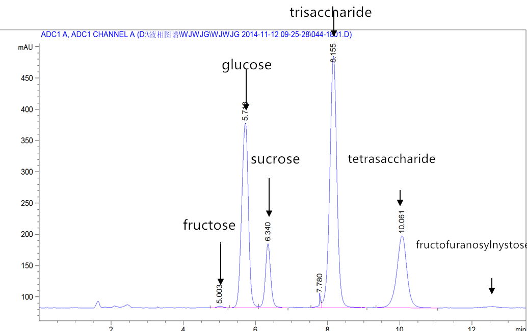 Na produção de oligofructose, a concentração de sacarose é de 60% (p/v). Depois que a matéria-prima for dissolvida, ajuste o pH a 5,5, mantenha a temperatura para 55-60 ℃ e adicione a frutosiltransferase. A dosagem recomendada é de 0,5 L/T sacarose (base seca) e o tempo de transglicosação é de 16 horas. Finalmente, obtemos os seguintes resultados do conteúdo: 0,99% de frutose, 28,66% de glicose, 12,33% de sacarose, 36,35% de trissacarídeo de frutas de cana e 21,68% de tetrasacarídeos de frutas de cana.